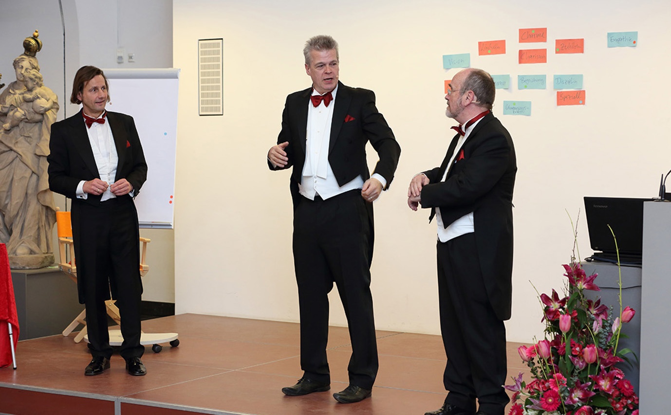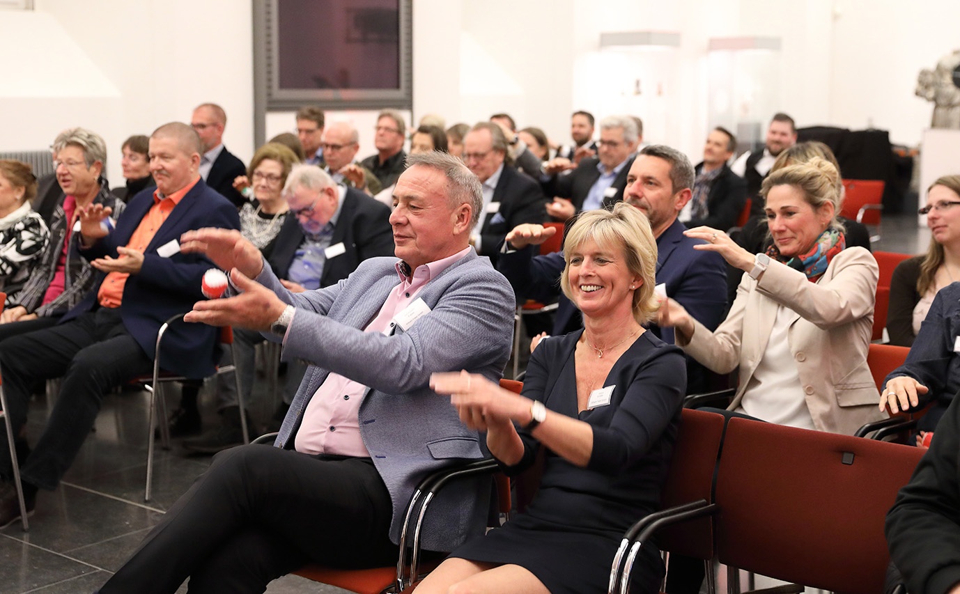 Der Vortrag der drei Trainöre, bestehend aus Stephan Ehlers, Hans Grünzig und Uwe Hermannsen, war ein unterhaltsamer und amüsanter Streifzug durch viele Facetten des Lebens. Sollte man zuerst sein Denken und daraus resultierend sein Verhalten ändern? Es wurde im Laufe der Trainment-Show jedem klar: ändere dein Verhalten, probiere Neues mutig aus – dann verändert sich auch dein Denken. Aktiv sein, das war auch für das Publikum während des Programmes immer wieder eine Herausforderung – Bälle wurden zum Handwerkszeug der Motorik, wertvolle Eindrücke entstanden bei dem Versuch mittels „mentaler Stärke“ seinen Körper standhafte Signale zu setzen. Mehr als ein Versuch war es nicht … Nach dieser spritzigen, informativen und eindrucksvollen Performance und der anschließenden Verlosung der Tombola Preise von W+S Werbeservice GmbH und Jobware, trafen sich alle Gäste im Foyer des Landesmuseums am Büfett zum regen Netzwerken.